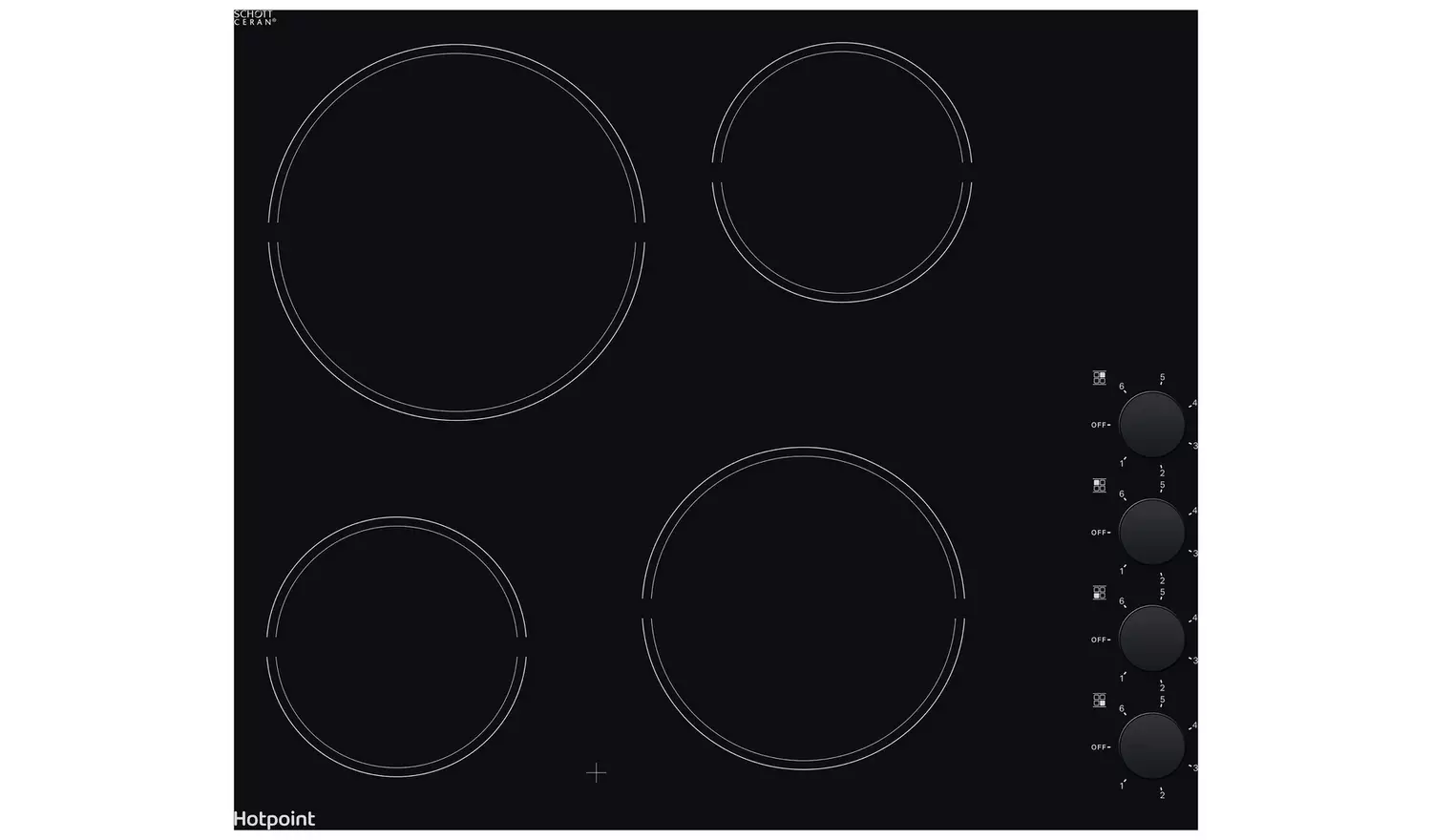 - This Hotpoint hob's 4 ceramic zones let you juggle multiple pots and pans at dinner time - Whether you're frying, searing or boiling, choose from 6 power levels and get the perfect heat - The residual heat indicators will let you know if a zone is still hot so there'll be no painful accidents - Its flat surface is easy to wipe clean if your pasta sauce splatters during cooking - Make adjustments quickly and easily with the dial controls on the right hand side
